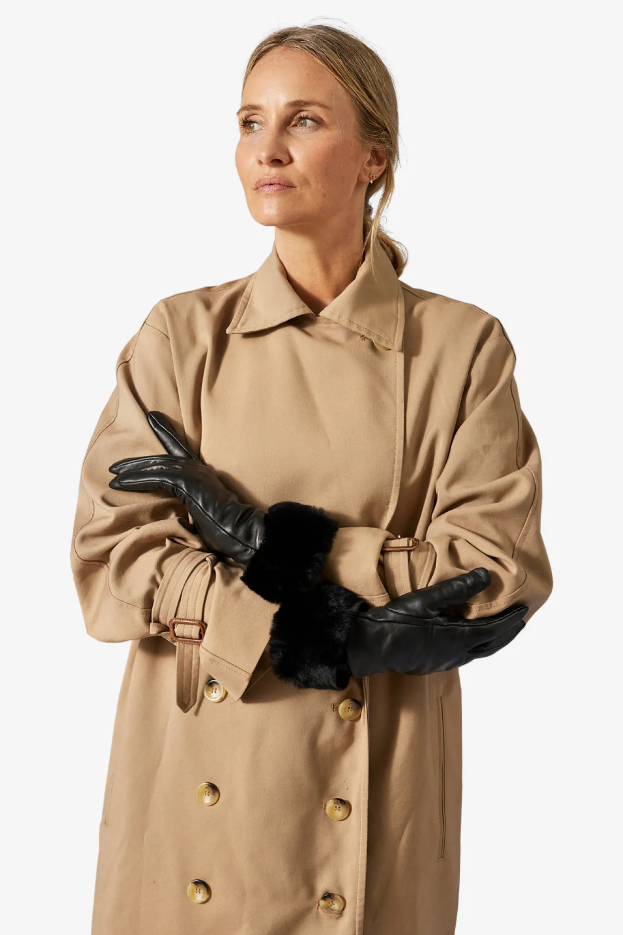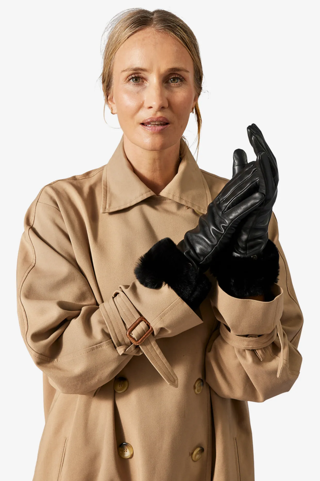 Ebba gloves from Adax. Beautiful glove in smooth leather with a finishing edge of fake fur which gives the glove an elegant look. Warm lining in 85% wool and 15% cashmere. There is a touch function in the index and thumb on both the right and left gloves.