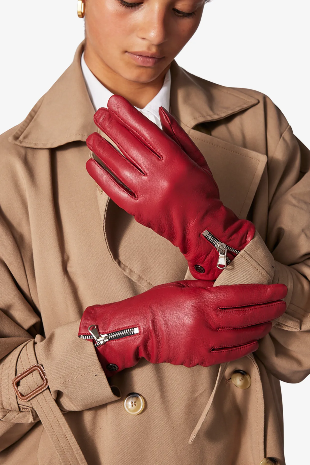 Adax glove Enya. Nice plain glove in smooth leather with zipper detail on the upper side of the glove. Warm lining in 85% wool and 15% cashmere. There is a touch function in the index finger and thumb on both the right and left glove.
