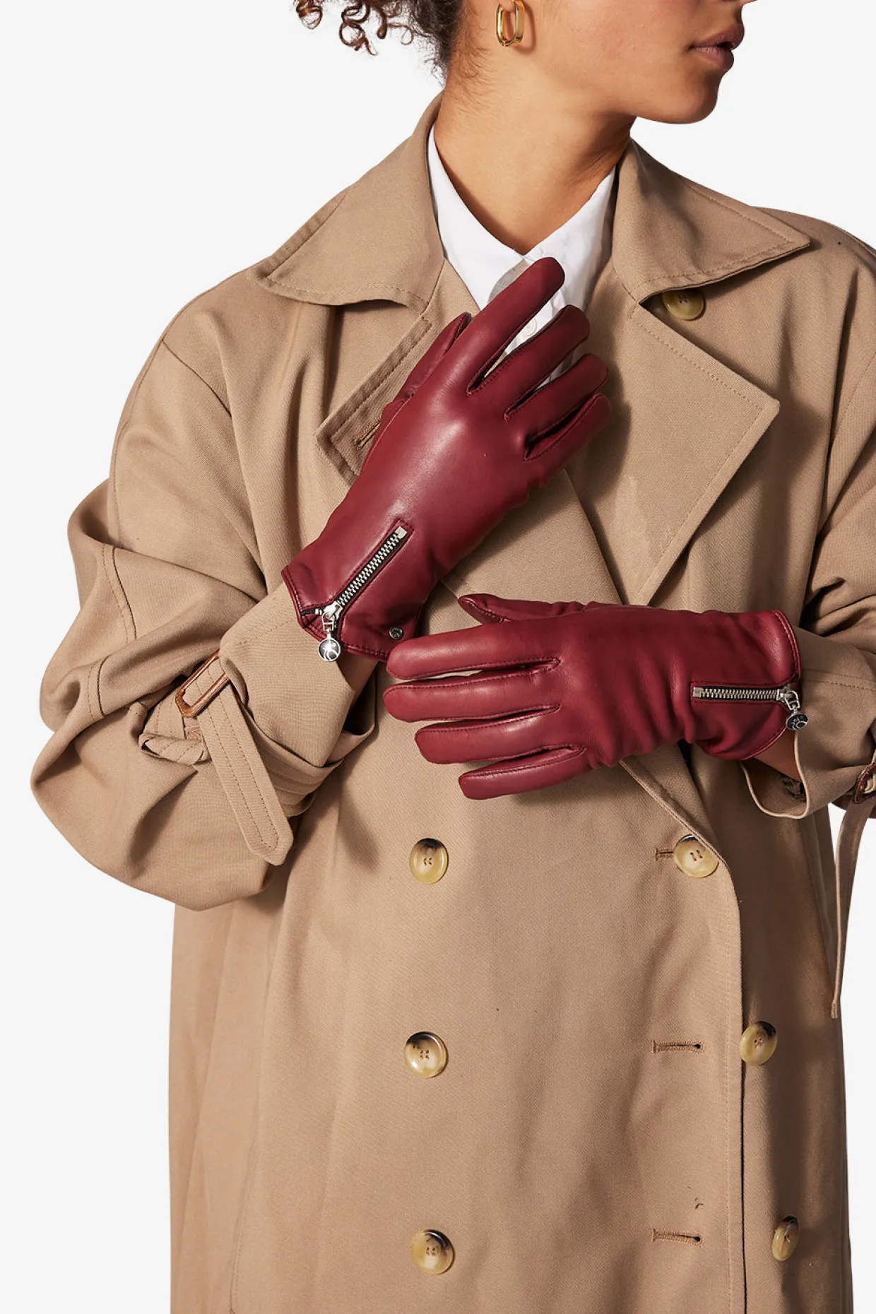Adax glove Sanne. Nice plain glove in smooth leather with zipper detail on the upper side of the glove. Warm lining in 85% wool and 15% cashmere. There is a touch function in the index finger and thumb on both the right and left glove.
