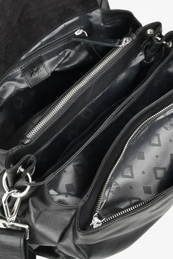 Simona is a very spacious everyday bag.The bag has three large, open compartments and two zipper compartments.In the one open compartment it has a smaller flat zippered pocket placed in the lining. In another of the open compartments there is an open leather pocket for the small things that needs to be easy to grab.To provide optimal comfort, the shoulder strap is extra wide, and can both be adjusted in length and removed entirely if desired.The bag is closed by a large leather flap with magnetic button.