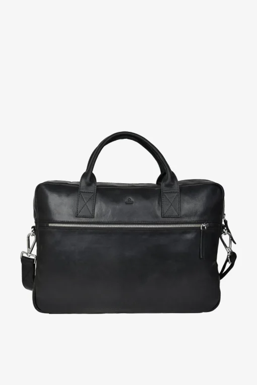 Tobias is a great and simple briefcase in high quality leather, with enough room for what you may need to carry with you in your everyday life.The bag has a top zipper closure and can be carried in the two handles or in the detachable and adjustable shoulder strap. The outside features a zip pocket on the front with room enough for a wallet, keys etc.The inside features one large room and a pocket for a laptop with Velcro closure. Also, there is a small zip pocket, two open pockets and two leather penholders.