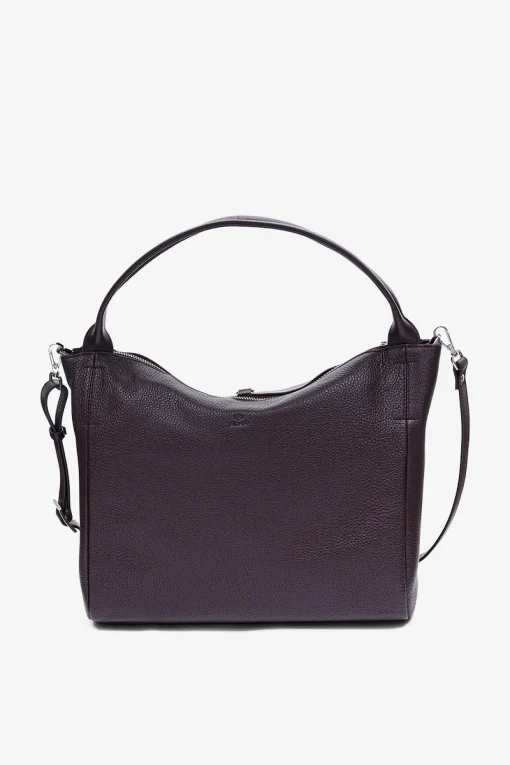 Emilia shoulder bag in Cormorano leather by Adax. Emilia has two fixed carrying handles and a long removable adjustable strap. The bag closes with a zipper at the top. Inside there are two compartments divided by a zipped pocket. In the lining there is a small zipper pocket and an open leather pocket. A warranty leaflet that can be used as a card holder and a cotton net is included