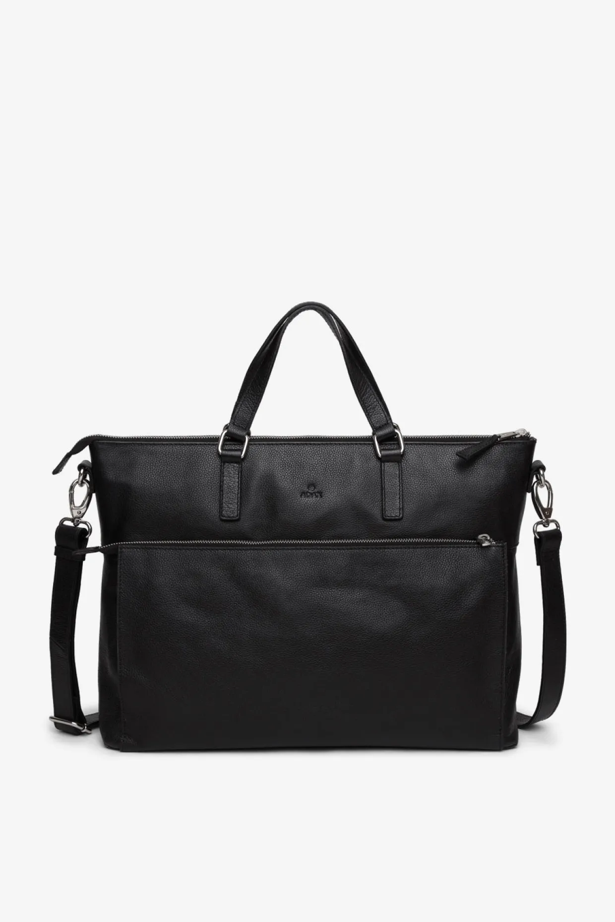 Sasha is a really nice working bag and the little sister to the larger Michelle working bag. It is made of very durable leather and has many great details both inside and out.The bag has a zipper closure and may either be carried in the two handles or in the detachable and adjustable shoulder strap. There is a large zipper pocket with great space, on the front.Inside, there are two great rooms separated with a thin zipper pocket. In one of the rooms, there are two well-protected pockets with Velcro closure for a laptop or tablet. In the other room, there is a large zipper pocket with two small pockets and two holders for pens.Further is a leather keychain, which can be clicked on and off as needed.The bag can hold a computer up to 17 inches.