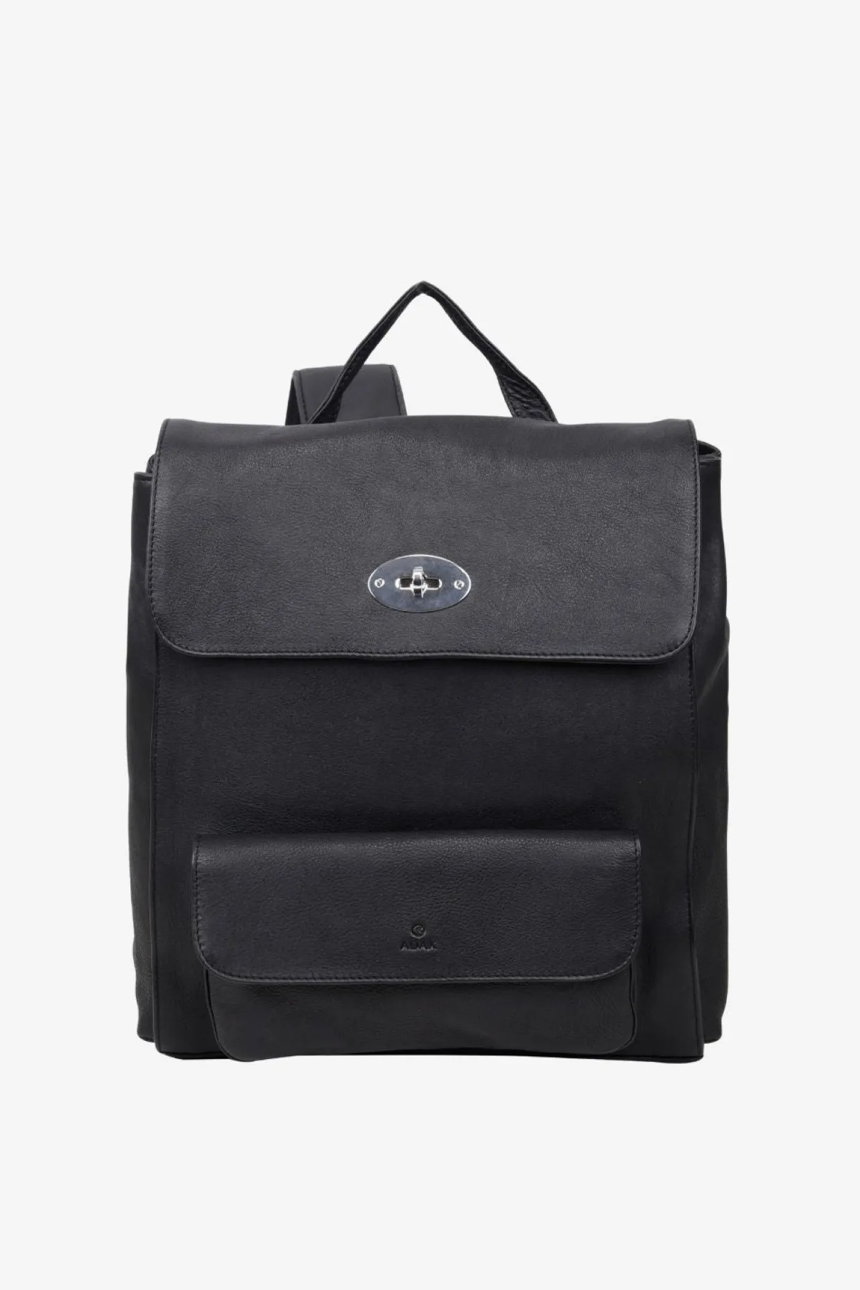 Maggie backpack in Ravenna leather from Adax. The backpack comes with 2 adjustable shoulder straps and a small carrying handle. The backpack closes with a swivel lock on the flap. On both sides of the backpack there are push buttons that allow the compartment to be expanded in size. Inside there is a large open space. On one side there is an open leather pocket and on the other side a small zipper pocket. On the front of the backpack there is a small pocket with magnetic closure.