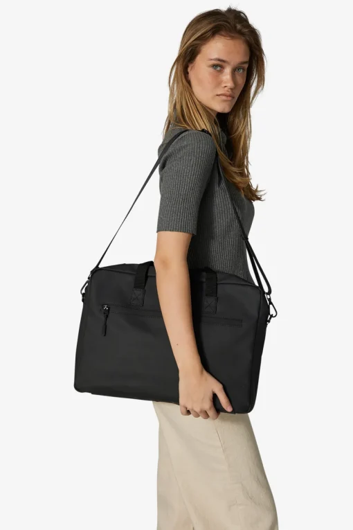 Niki is a cool and timeless computer bag in a minimalistic design, which is perfect for everyday life! The bag is made with a rubberized surface, which makes the bag and the zipper construction water-resistant, which is why it fits any outfit and purpose. No worry, you can easily bring your Niki bag on the bike, in all kinds of weather. Niki is a work bag which is divided into two compartments, both of which are opened with a zipper. In the back partition you will find a computer pocket, and in the front, you will find a zipper pocket and space for your pens. The folder has 2 carrying handles and an adjustable shoulder strap. The bag can hold a computer up to 15,6”.